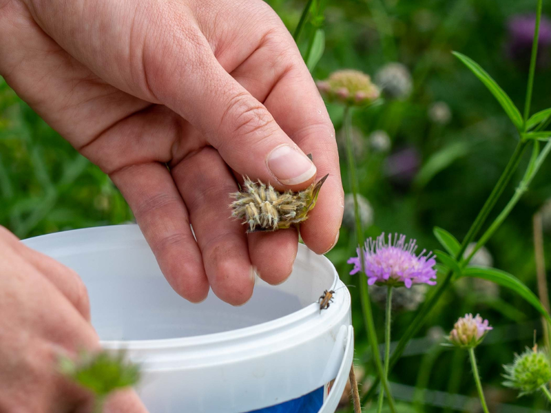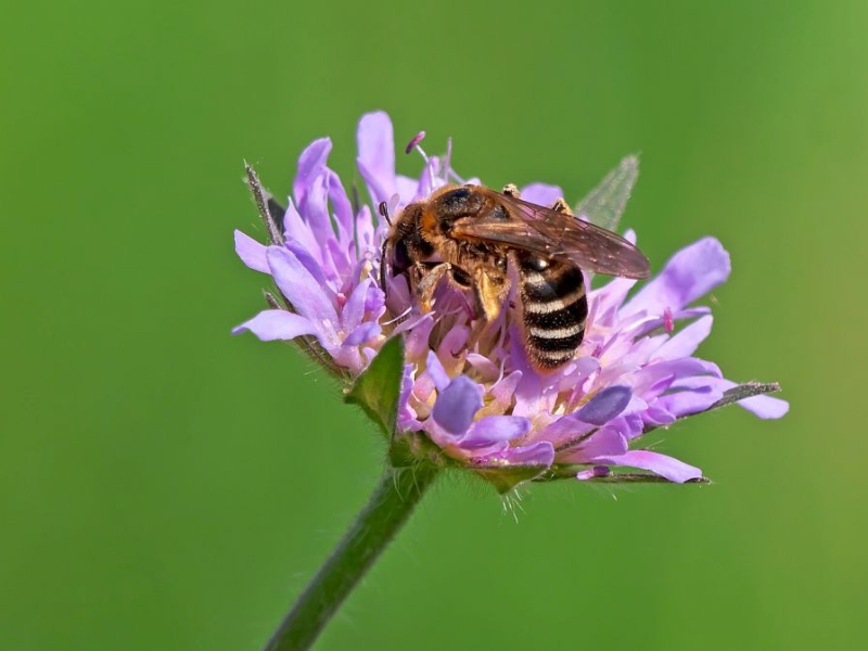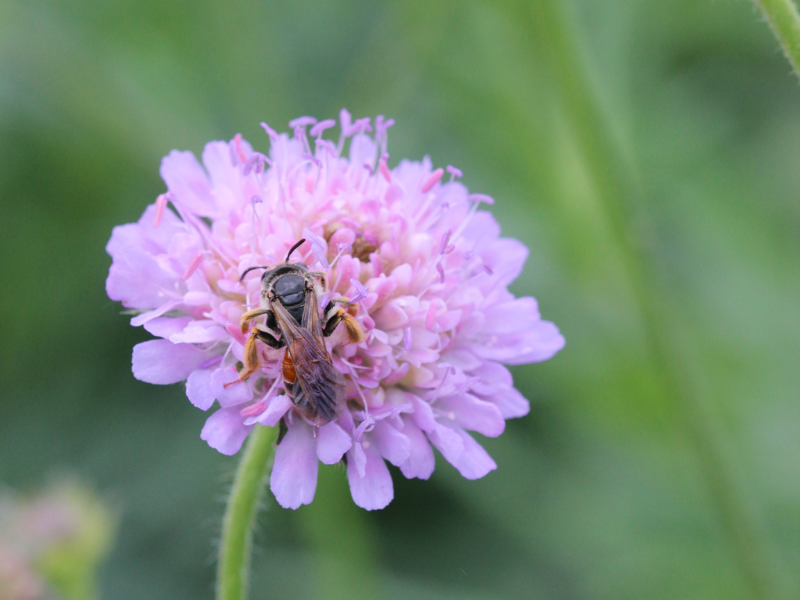 Die Acker-Witwenblume hat einen großen Fan unter den Wildbienen: Die Knautien-Sandbiene (Andrena hattorfiana). Abgesehen von der Tauben-Skabiose (Scabiosa columbaria), die aber in Sachsen selten ist, sammelt diese markante Wildbiene nämlich vorrangig Pollen der Acker-Witwenblume. Doch viele weitere, unspezialisierte Wildbienen nutzen ebenfalls die Acker-Witwenblume als Nahrungsquelle. In Dresden sind das beispielsweise die Vierbindige Furchenbiene (Halictus quadricinctus), die Gewöhnliche Furchenbiene (Halictus simplex), die Gewöhnliche Schmalbiene (Lasioglossum calceatum) und die Weißgebänderte Furchenbiene (Lasioglossum leucozonium).