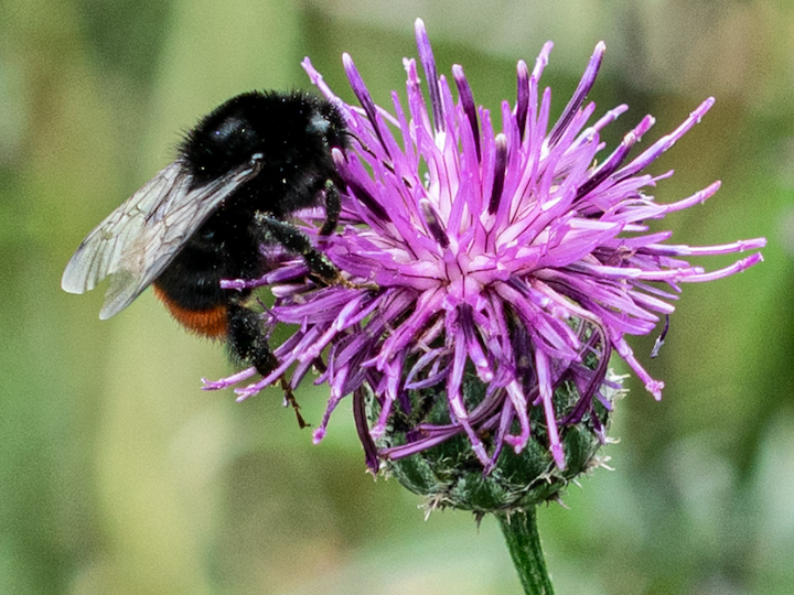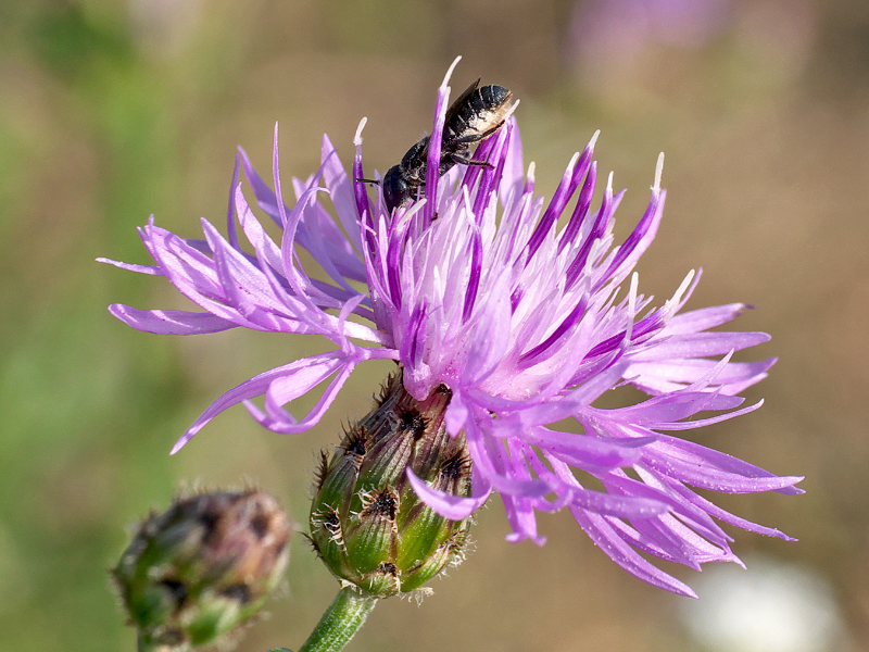 Wie viele Korbblütengewächse ist die Skabiosen-Flockenblume eine wichtige Wildbienenpflanze, die auch Schmetterlinge und andere Insekten versorgt. Durch ihre sehr lange Blütezeit von Ende Mai bis in den Oktober kann sie vielen verschiedenen Wildbienen mit unterschiedlichen Flugzeiten Nahrung bieten. Im Raum Dresden wird sie vor allem von der Schuppenhaarigen Kegelbiene (Coelioxys afra), der Dunkelfransigen Hosenbiene (Dasypoda hirtipes), der Gelbbindigen Furchenbiene (Halictus scabiosae) und der Gekerbten Löcherbiene (Heriades crenulatus) besucht. Mit etwas Glück können Sie sogar die seltene Flockenblumen-Blattschneiderbiene (Megachile apicalis) beobachten, die auf dem Weißeritzgrünzug nachgewiesen wurde.