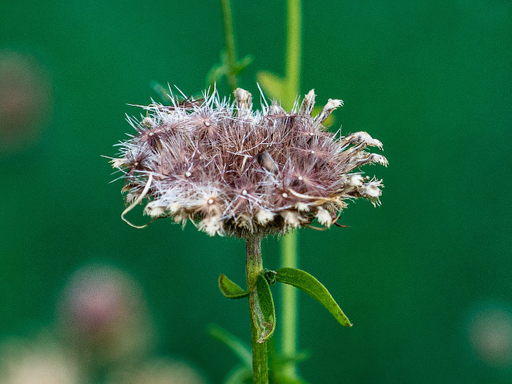 Der kugelig wirkende Blütenkorb wird dicht dachziegelartig von Hüllblättern mit einem schwarzen Rand umschlossen. Die Kronblätter der Einzelblüten (nur Röhrenblüten) sind purpurfarben.