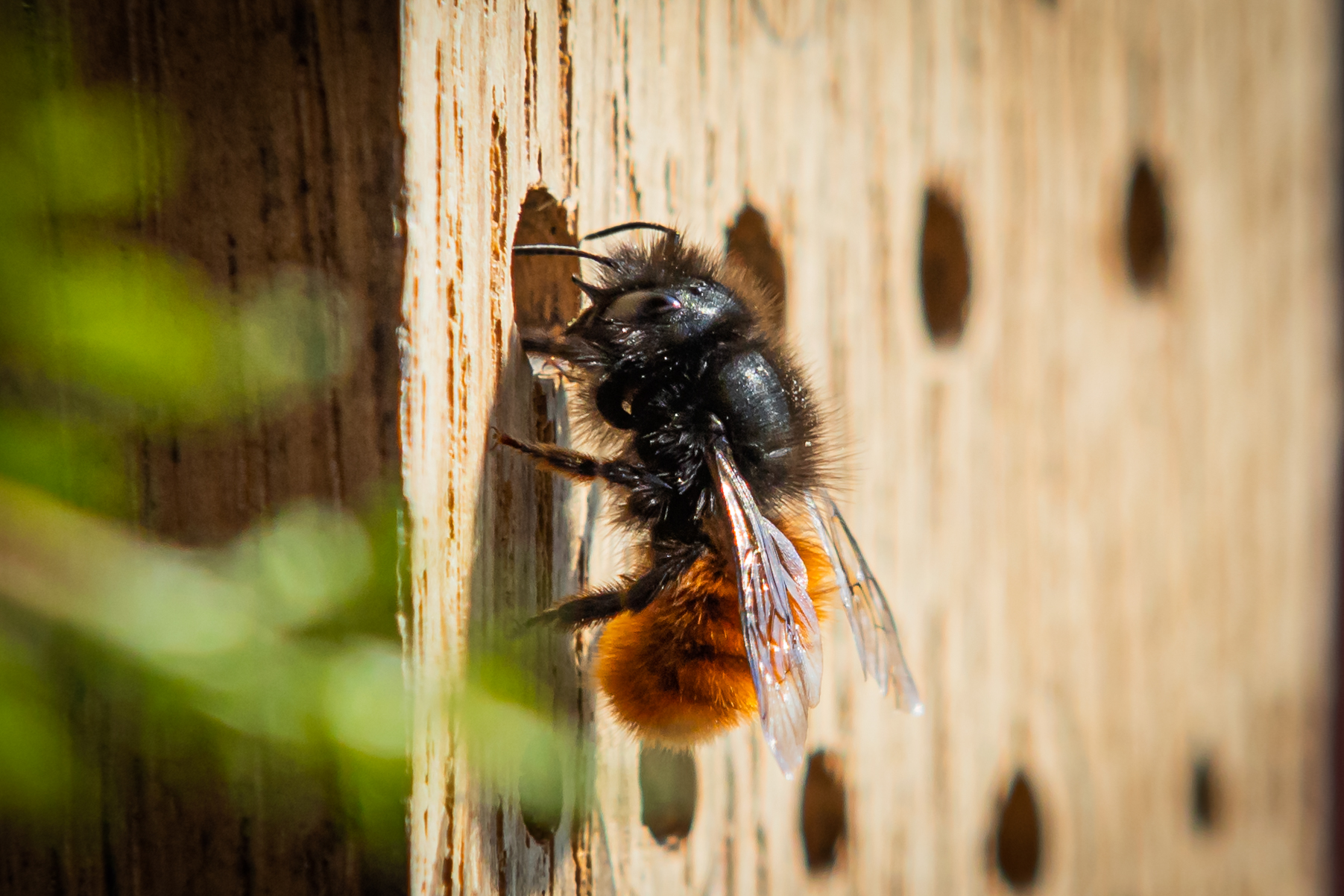 Wer im März aufmerksam ist, kann schon die ersten Wildbienen sehen. Neben Holzbienen und Hummelköniginnen sind dann bereits einige Gehörnte Mauerbienen (Osmia cornuta) unterwegs. Die Gehörnte Mauerbiene profitiert von einem zeitigen, milden Frühjahr, das besonders im urbanen Raum stark ausgeprägt ist. Für ihre Suche nach Pollen und Nektar ist die Gehörnte Mauerbiene auf frühblühende Pflanzen angewiesen. In Siedlungen findet sie u. a. neben Kräutern wie Hohler Lerchensporn, Löwenzahn und Hohe Schlüsselblume auch Gehölze wie Schlehe, Kirschpflaume, Sal-Weide und Eingriffeligem Weißdorn. Nicht selten trifft man sie außerdem bei Gartencentern an, wo Primeln und Hyazinthen verkauft werden. Die Gehörnte Mauerbiene verdankt ihren Namen den zwei hörnerähnlichen Strukturen, die die Weibchen im Gesicht tragen und mit bloßem Auge erkennbar sind. Sowohl Männchen als auch Weibchen haben einen rostrot behaarten Hinterleib, der sich vom restlichen, schwarz gefärbten Körper stark absetzt. Nur das Gesicht der Männchen ist dicht weiß behaart. Die gehörnte Mauerbiene nistet in vorhandenen Hohlräumen, die natürlicherweise z. B. verlassene Nester anderer Bienenarten sind. Als Kulturfolger hat sie sich jedoch bestens an hohle Stängel in künstlichen Nisthilfen angepasst und kann dort große Bestandszahlen erreichen.